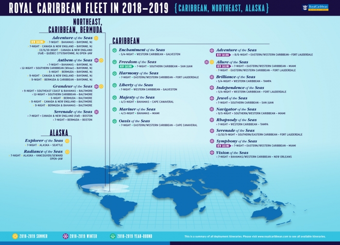 The 915-foot cruise ship will sail 7-night itineraries to culture-rich destinations across the Bahamas and Yucatan Peninsula. Her 989-foot sister ship Enchantment of the Seas will move from Miami, Florida to join Liberty of the Seas in Galveston, Texas, offering 4- and 5-night Caribbean cruises that will complement Liberty’s popular 7-night Caribbean vacations.